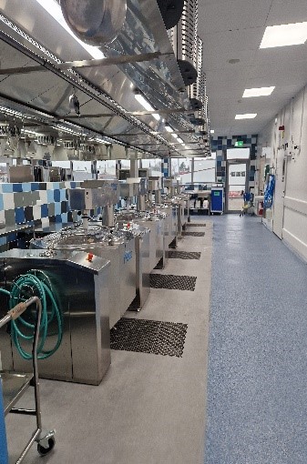 Studiebesöket på Överby produktionskök var en spännande upplevelse! Det genererade mycket inspiration och visade oss framtidens kök redan nu. Köket som nyligen tagits i drift inrymmer idag produktion till skola och förskola för delar av Trollhättans stad. Produktionen varierar mellan 7500–11 000 portioner per dag och hanteras av en personalstyrka på 12 personer. Denna mäktiga produktion hanterar ett råvaruflöde på 10 ton i veckan. Det är inte bara den omfattande produktionen som är imponerande, utan också lokalen och dess moderna utrustning. Hela byggnaden är på 1890 Kvm och bygger på principen – Mat in möter aldrig mat ut. Naturligtvis har miljöaspekter också varit en stor del i processen, tex finns både bergvärme och solenergi i byggnaden. En annan aktuell aspekt man har haft med i planeringen från start är beredskapsfrågan, så det finns både inbyggda lösningar för reservvatten och el.