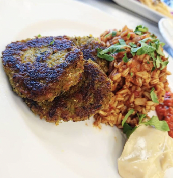 Broccoli- och linsbiffar med kikärtsmajo, tomatvete och paprikacreme
